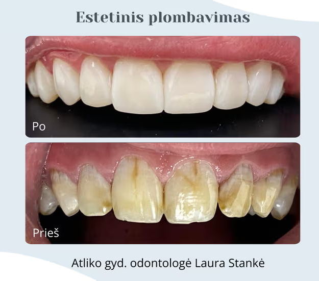 Atkuriama dantų forma, spalva ir skaidrumas, maksimaliai išsaugant natūralius audinius.